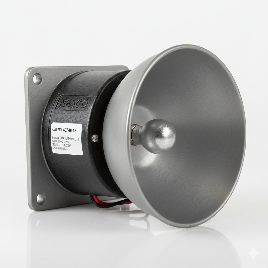 The NESCO 437-10-12 is a high-performance industrial alarm bell from the Bells & Buzzers subcategory, specifically engineered for robust audible signaling in fire, security, and institutional systems. This model features a large 10-inch (254mm) gray steel gong designed to produce a loud, resonant, and continuous tone that easily penetrates high-ambient noise environments like warehouses or schools. Operating on a 12 VDC power supply, it is highly efficient and compatible with most standard low-voltage DC control panels. The unit is constructed with a rugged die-cast housing and a corrosion-resistant powder-coated finish, ensuring long-term durability and reliable performance. Its vibrating motor mechanism is built for high-torque output, providing a consistent decibel level for critical emergency alerts. Designed for versatility, it can be easily surface-mounted or attached to universal electrical backboxes for a clean installation. This NESCO alarm bell remains a gold standard for reliable, heavy-duty acoustic signaling in commercial and industrial applications.