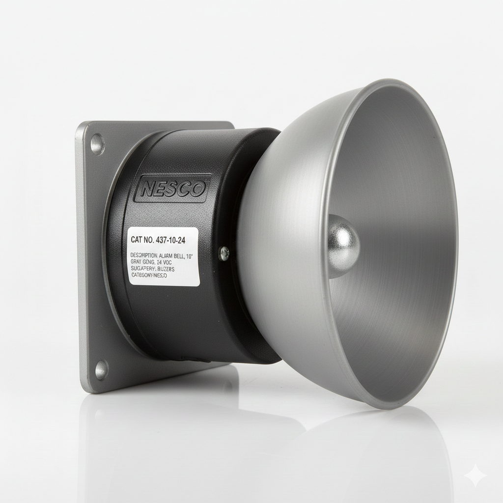 The NESCO 437-10-24 is a heavy-duty industrial alarm bell designed for high-performance audible signaling in large-scale environments. Part of the Bells & Buzzers subcategory, this unit features a substantial 10-inch (254mm) gray gong that delivers a powerful, resonant tone capable of cutting through extreme ambient noise in factories, warehouses, and mechanical rooms. Operating on a 24 VDC power supply, it is specifically optimized for integration with standard fire alarm control panels and industrial emergency systems. The bell is built with a rugged die-cast aluminum housing and a durable, powder-coated steel gong to ensure long-term reliability and resistance to corrosion. Its high-torque vibrating mechanism provides a consistent, high-decibel output essential for life safety alerts and evacuation signals. Designed for versatility and ease of use, it can be mounted directly to standard square electrical boxes, making it a dependable choice for contractors requiring a robust and effective acoustic warning solution.