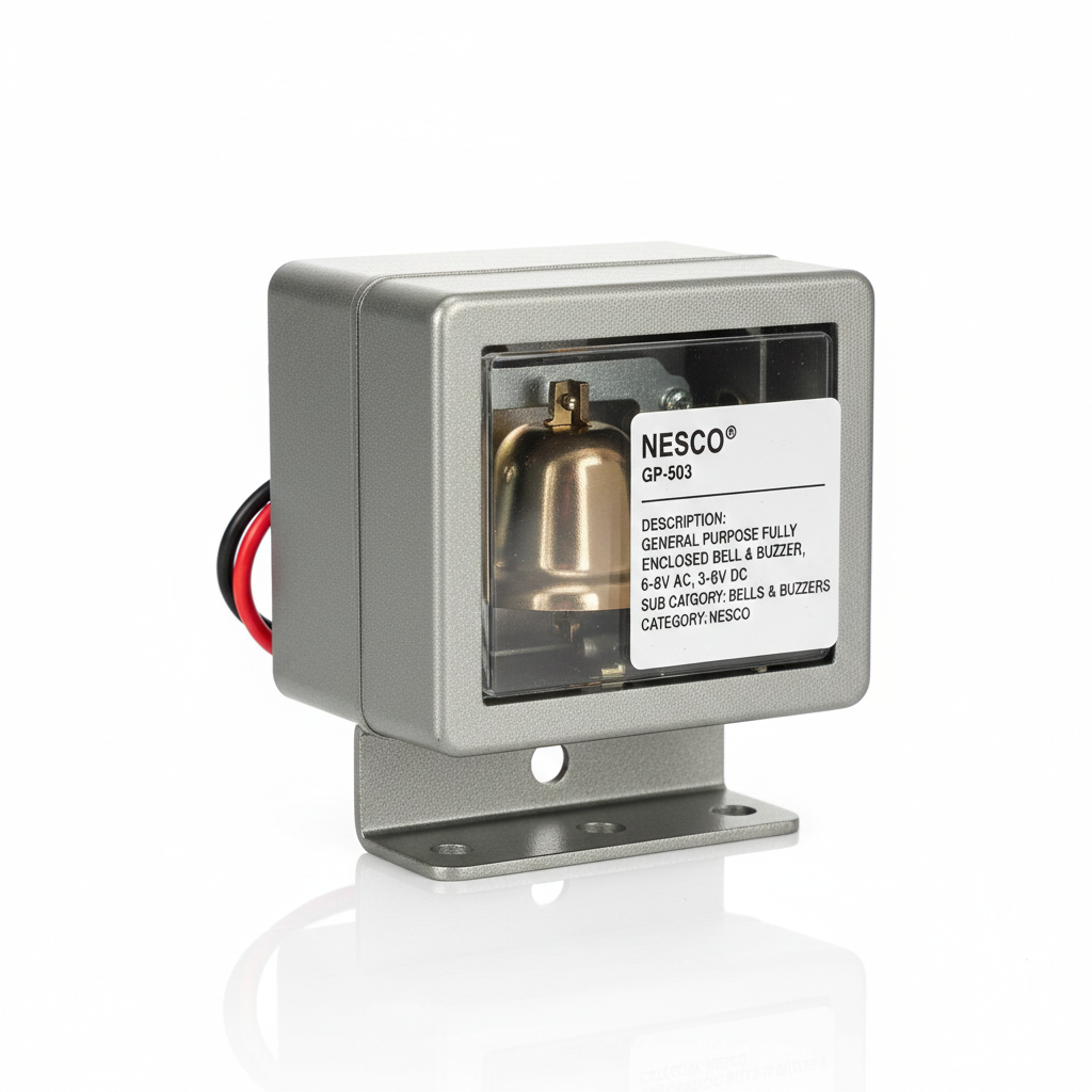 The NESCO GP-503 is a high-utility, General Purpose Fully Enclosed Bell & Buzzer combination unit, designed to offer flexible audible signaling in a single, compact device. Unlike single-tone units, the GP-503 is engineered to provide both a clear ringing bell tone and a distinct buzzing sound, making it an excellent choice for multi-signal environments—such as distinguishing between a front door and a side entrance, or signaling different stages of an industrial process.Its fully enclosed design features a durable protective housing that shields the internal strikers and components from dust, debris, and accidental damage, ensuring long-term reliability and a clean, professional appearance. This unit is optimized for low-voltage operation, functioning efficiently on 6-8V AC or 3-6V DC, which allows for seamless integration with standard door chime transformers, battery packs, or localized control circuits.