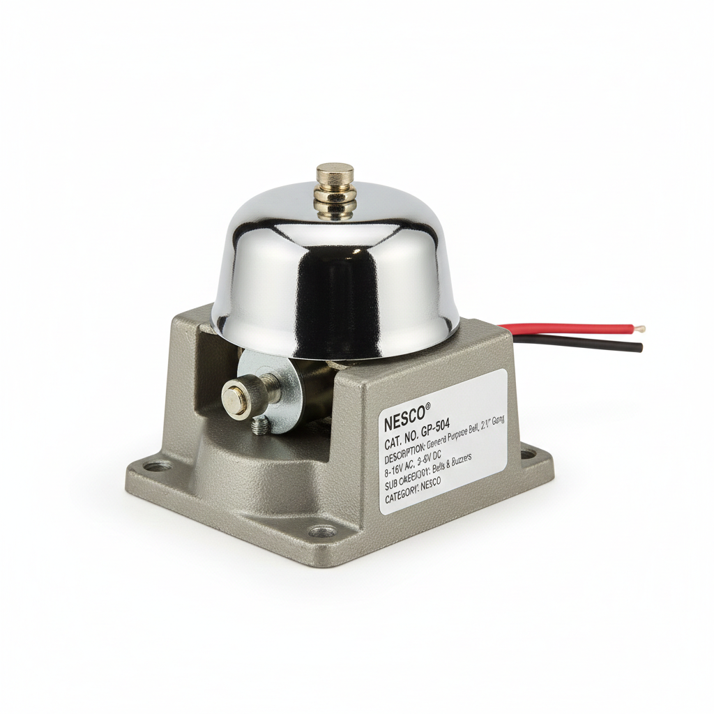 The NESCO GP-504 is a classic, open-gong General Purpose Bell designed for clear, audible signaling in residential and commercial environments. Featuring a 2 1/2″ polished chrome gong, this unit produces a bright, traditional ringing tone that is easily distinguishable from background noise. Its compact footprint makes it an ideal choice for door alerts, telephone extensions, or localized “call” signals in offices and small shops.