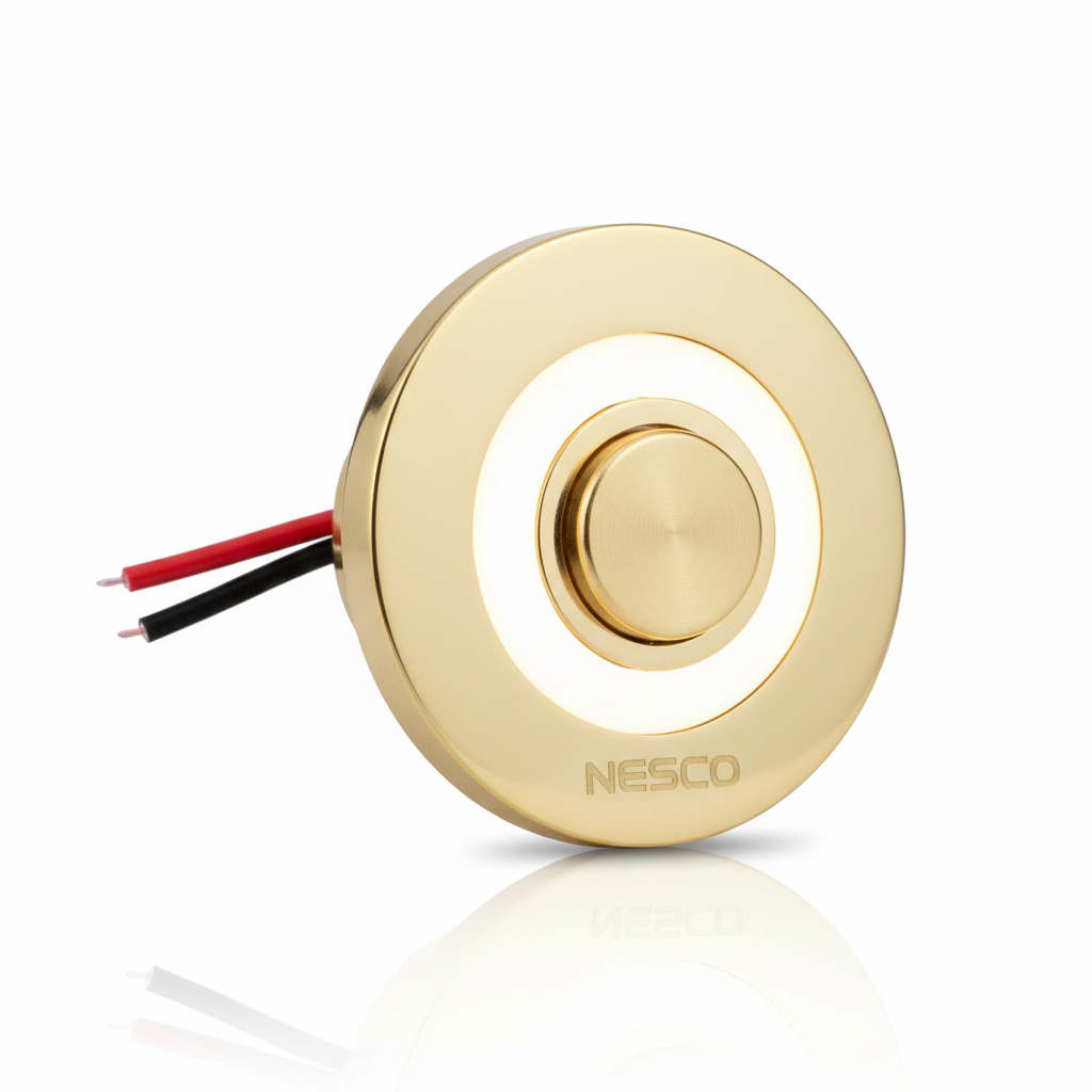 The NESCO PB-305BL is a premium Lighted Flush Mount Low Voltage Push Button, combining elegant aesthetics with enhanced nighttime visibility. Finished in a sophisticated polished brass, this model features an integrated light source that illuminates the actuator, making it easy for guests to locate in low-light or dark conditions.