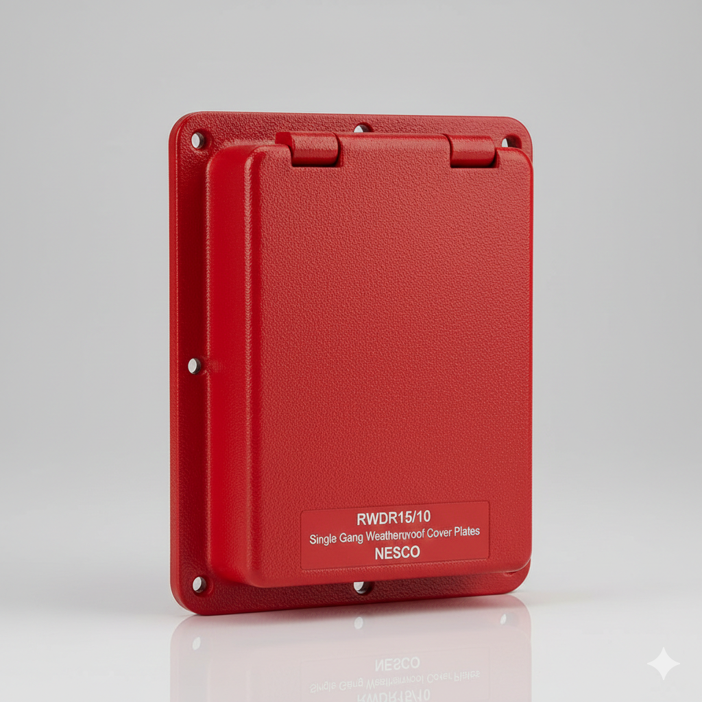The NESCO RWDR15/10 is a heavy-duty Single Gang Weatherproof Cover Plate finished in a high-visibility red powder coating, specifically designed for emergency or fire-safety-related electrical applications. Built from rugged die-cast metal, this cover provides exceptional protection for receptacles and switches in outdoor or high-moisture environments. Its deep-profile “In-Use” design features a spring-loaded flip lid that maintains a tight, weather-resistant seal against rain, snow, and dust when not in use.
