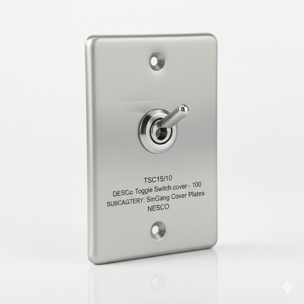 The NESCO TSC15/10 (Part Number 077616) is a high-quality Single Gang Toggle Switch Cover designed for durability and precision in commercial and industrial electrical systems. This cover plate is specifically engineered to fit standard single-gang electrical boxes, providing a secure and professional housing for toggle-style switches. Manufactured from industrial-grade material with a sleek, brushed metallic finish, it offers superior resistance to impact, corrosion, and heavy wear, making it ideal for high-traffic environments like warehouses, factories, and mechanical rooms. The design features a centered aperture that ensures smooth mechanical operation of the switch lever while maintaining a tight seal against the mounting surface. With pre-drilled mounting holes for quick installation, this NESCO plate combines functional reliability with a clean, professional aesthetic. Often distributed in bulk packs of 100 units, it remains a go-to solution for large-scale electrical contractors requiring consistent quality and standardized fit across major projects.