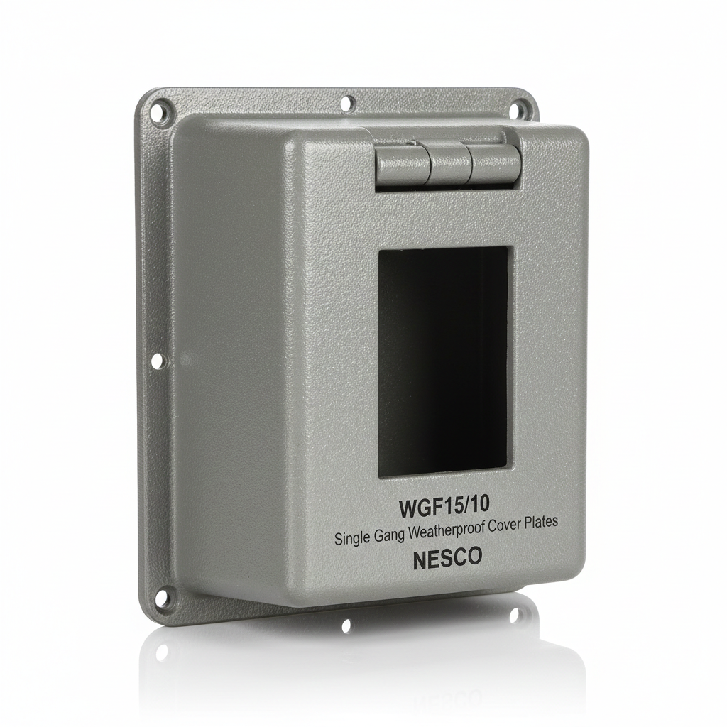 The NESCO WGF15/10 is a specialized Single Gang Weatherproof Cover Plate specifically designed to accommodate and protect GFCI (Ground Fault Circuit Interrupter) outlets in demanding environments. Fabricated from high-strength die-cast metal with a textured, corrosion-resistant finish, this cover is built to safeguard sensitive safety receptacles from moisture, dust, and debris. Its defining feature is the rectangular “Decorator” style opening, precisely sized for GFCI or other large-body devices, ensuring a seamless fit and maintained electrical integrity.This model utilizes a robust, spring-loaded flip lid that provides a positive snap-shut seal when the outlet is not in use, meeting rigorous safety standards for outdoor and wet locations.