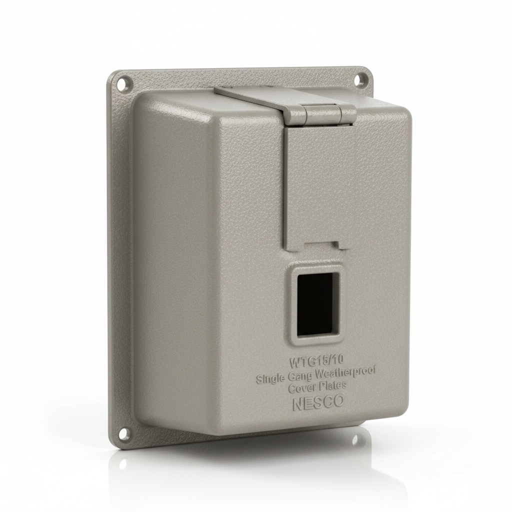 The NESCO WTG15/10 is a professional-grade Single Gang Weatherproof Cover Plate specifically designed for Toggle Switch applications in outdoor or moisture-prone environments. Constructed from heavy-duty die-cast metal with a corrosion-resistant gray powder coating, this cover ensures long-term protection for standard electrical switches against rain, snow, ice, and dust.